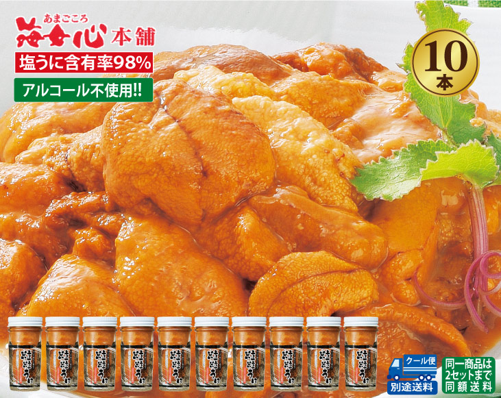 うにの取扱高で日本有数の食品メーカー「海女心本 舗」が国内で生産した粒うに。濃厚で、奥深いまろや かな甘味と磯の香り、トロリと溶ける舌触りは格別で す。通常、塩うに含有率が65%以上あれば「粒うに」と呼ば れますが、本品はなんと含有率が98%。しかも、アルコール 不使用で、うに本来の旨味を最大限に引き出しています。