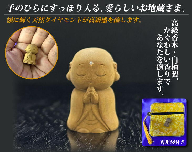 心に平穏をもたらす、手のひらサイズの愛らしい白檀製のお地蔵様。霊徳宿る高級香木である白檀を使い、日本の人間国宝にあたる、中国工芸美術大師・葉小鵬が製作。額に天然ダイヤモンドを配し、価値ある作品に仕上げました。いつも身に漬けてお地蔵様の功徳を身近に感じていただけます。高貴な香りであなたを癒す白檀製。お出掛けの際は専用袋に入れてお持ちください。