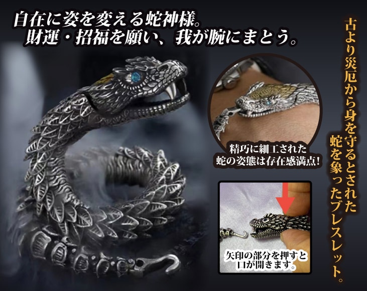 吉祥・招福の神として古より進行されてきた蛇をモチーフにした、自在に姿を変えるブレスレット。ブレスレット以外にも、精巧なオブジェとしてインテリアにしてもカッコいい。力強く神々しい姿は厄除け・開運のお守りとして身にお付けください。