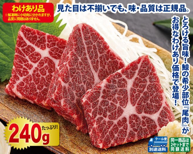 尾肉はその名の通り、鯨の尾に近い部位の赤身と脂の混ざる希少な部位。脂がしっかりとのりながらも、しつこさがなく、刺身にすると口の中でとろけるような味わいが楽しめます。今回は、製造過程で切り落としとなった尾肉の中から、特に脂のりがよく旨みの強い部分を厳選。240gパックにして、お求めやすい価格でご用意しました!