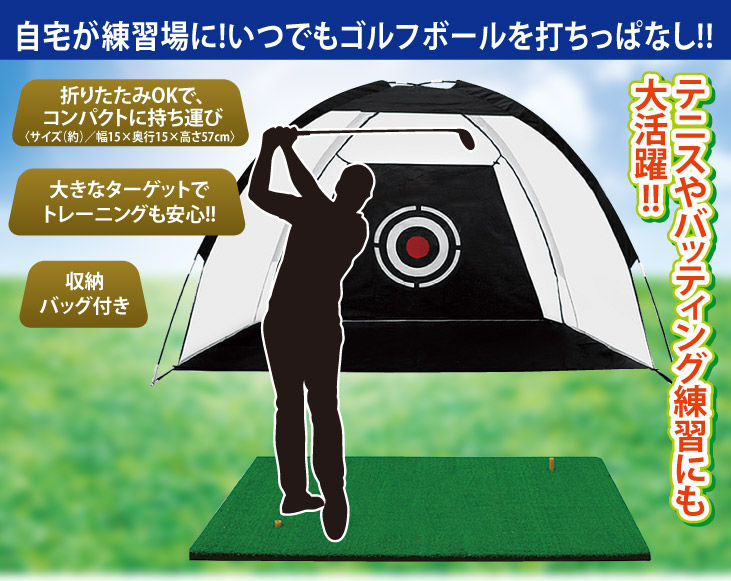 ビッグサイズで、自宅の庭やガレージで本格的にゴルフ練習に取り組むことができるトレーニングネットです。球受け付きでボールが散らかりにくい構造。据置きでの使用も可能で、ペグで簡単に固定できます。本格的な練習でスコアアップを目指す方にお薦めです。
