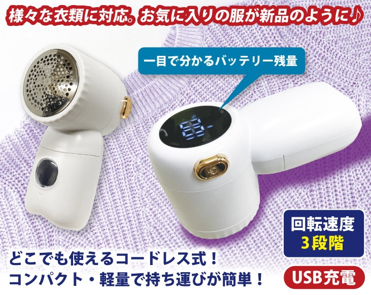 セーターなどのニット製品や靴下などの天敵「毛玉」手ではなかなか取れない毛玉を簡単に取ってくれます。 3段階の回転パワーで布地に合わせて絡んだ毛玉をキレイにカット。着たまま、ハンガーにかけたままでも使用可能。 残りの電池残量が確認できる大きな画面付き。 USBケーブルで充電するだけで使えるので、コードレスで場所を選ばずいつでも使えます。
