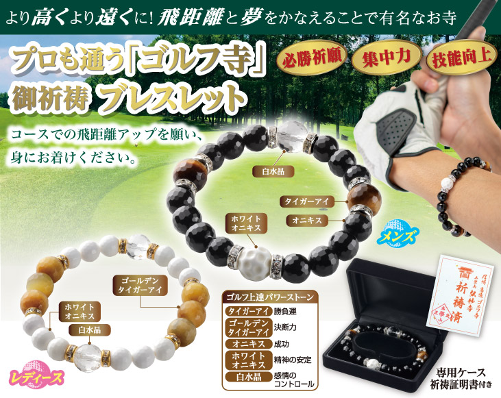 精神的な集中力と肉体的な調和が大切と言われるゴルフプレーヤーたちが、スコアアップを願い訪れるという通称『ゴルフ寺』こと「弘妙寺」で祈祷されたブレスレット。集中力を高め、飛距離アップにつながるよう願い、身にお付けください。
