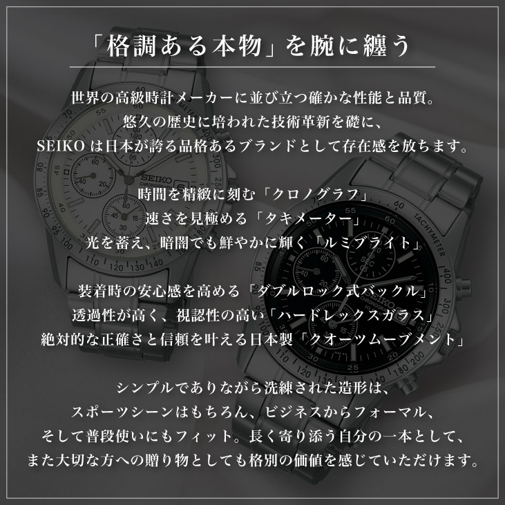 スタイリッシュなデザインと確かな機能性を兼ね備えたセイコーのクロノグラフシリーズ。精悍なフェイスとスポーティなクロノグラフ機能は、ビジネスシーンからカジュアルまで幅広く活躍。視認性の高い文字盤と信頼のセイコークオーツムーブメントで、日常使いにも安心。オンオフ問わず腕元を引き締める、頼れる一本です。