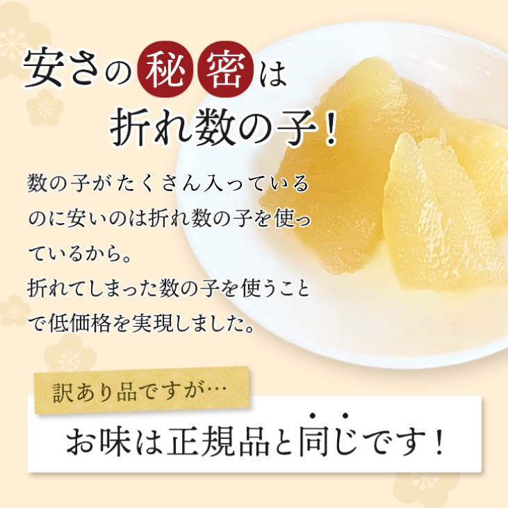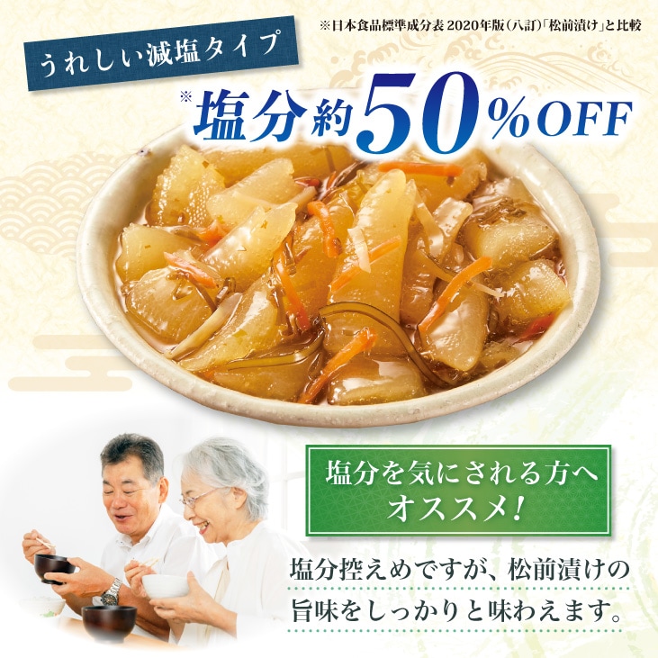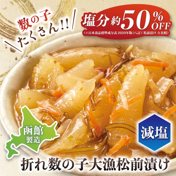 日本食品標準成分表2020年版(八訂)「松前漬け」と対比し、塩分を約50%カット。減塩仕立ての松前漬けです。折れ数の子を使用する ことで味が良く馴染み、しかも低価格に。あご出汁入りなのでスッキリとした上品な味わいを実現。規格外の折れ数の子をたくさんご堪能 いただける、訳あり品ならではのお得感いっぱいの松前漬けです。
