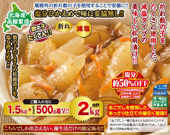 北海道・函館製造 減塩 折れ数の子大漁松前漬け1.5kg+500g 合計2kg
