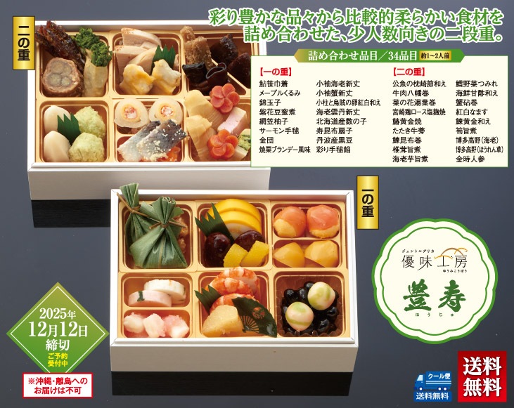 彩り豊かな品々から比較的柔らかい食材を詰め合わせた、少人数向きの二段重。