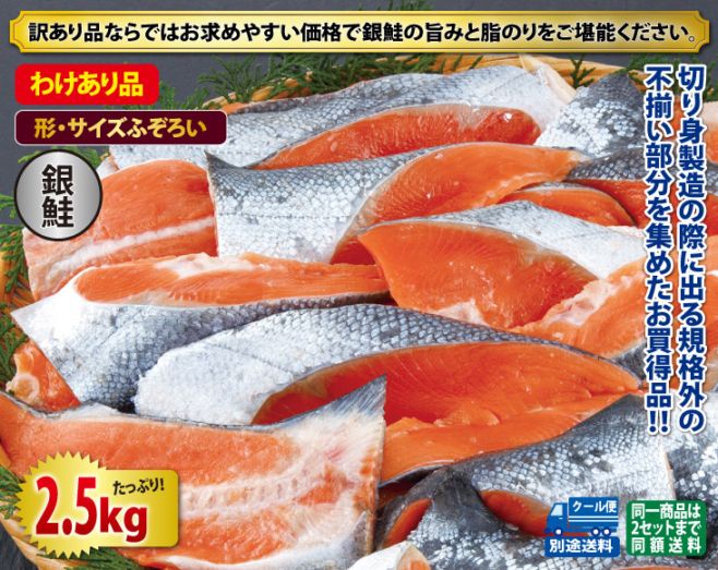 訳あり品ならではお求めやすい価格で銀鮭の旨みと脂のりをご堪能ください。