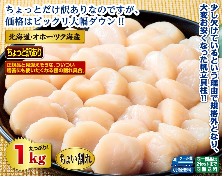 北海道・オホーツク海産 訳あり・ちょい割れ帆立貝柱1kgセット(生食用)