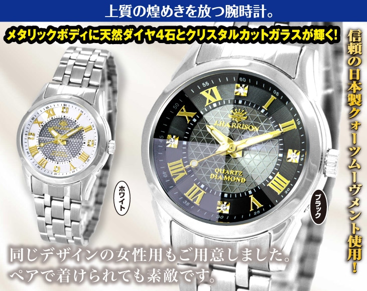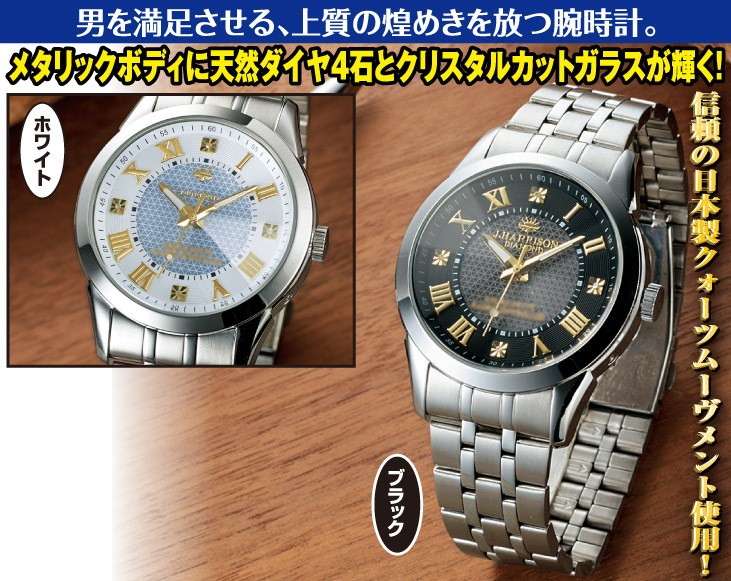 人気のジョン・ハリソンから信頼の日本製クォーツムーブメント使用の腕時計。重厚なメタリックボディにダイヤモンドとクリスタルカットガラスが優雅に輝くスタイリッシュなデザイン。男をもうワンランク上げるアイテムです。
